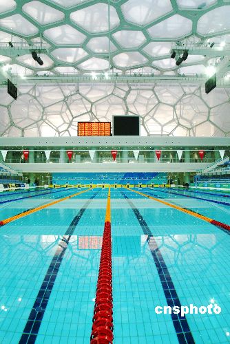 1月26日,北京奥林匹克公园内的北京奥运会游泳馆“水立方”,进行各项设施调试,以迎接1月31日在这里举行的“好运北京”中国游泳公开赛测试赛。中新社发 富田 摄
