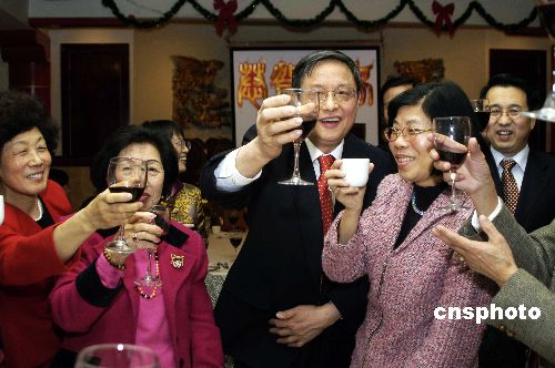 中国驻美大使周文重(中)及夫人谢淑敏女士(左一)和驻美使馆领事部全体外交官1月26日来到华盛顿特区唐人街,向大华府地区各侨社领袖拜年。图为周文重大使向侨领敬酒。中新社发 邱江波 摄