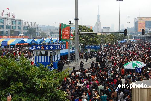 因受恶劣天气影响,京广铁路一百多趟客车大面积晚点,截至一月二十七日下午,仍有十五万旅客被迫滞留广州火车站广场。中新社发 柯小军 摄