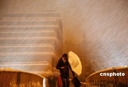 1月27日晚,行人在纷飞的大雪中和被积雪覆盖的道路上艰难的行走。当晚,江苏省南京市再次出现中到大雪的降雪过程,部分地区降雪量达10毫米以上,局部地区出现暴雪,江苏省气象台在当晚18时20分首次将暴雪黄色预警变更为暴雪橙色预警,提醒相关部门和市民做好防雪灾、防冻害和道路清扫、积雪融化工作。中新社发 钟山 摄