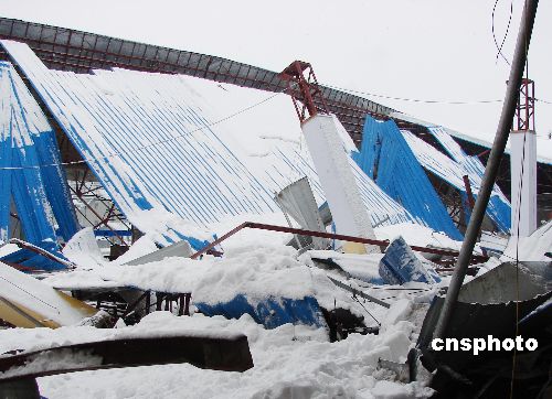 1月28日晨,连续多日的降雪,使江苏仪征雪深达20多厘米,厚厚的积雪压塌了仪征一家具城部分屋顶,幸末有人员伤亡。中新社发 黄建林 摄