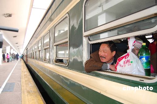 1月28日中午,一名登上回家列车的旅客开心地从车窗回望广州火车站。从26日到28日上午十时,广州火车站恢复开出列车五十六列,其中迂回开出列车三十列。但广州火车站仍有七万多名旅客滞留。中新社发 柯小军 摄