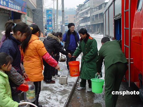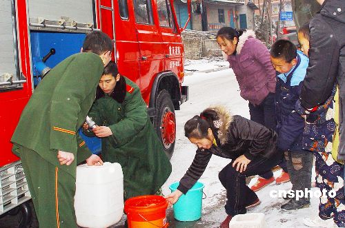 1月28日,重庆黔江消防官兵为自来水中断近一周的交通西路居民送水到户。连日来,重庆市近10个区县普降大雪,部分地区积雪最深度甚至超过20厘米,由于大雪覆盖,天气寒冷,一时间,黔江、武隆、酉阳、彭水等区县均出现公路结冰、电力中断、市民饮水困难情况,对群众生活造成极大困绕。中新社发 王松 摄