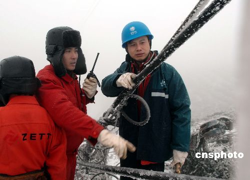 1月28日,浙江省送变电工程公司派出人员抢修绍兴西南地区的一条超高压受损线路。近日浙江省雪灾、冰灾情况进一步恶化,电网运行面临巨大挑战。中新社发 苏立建 摄