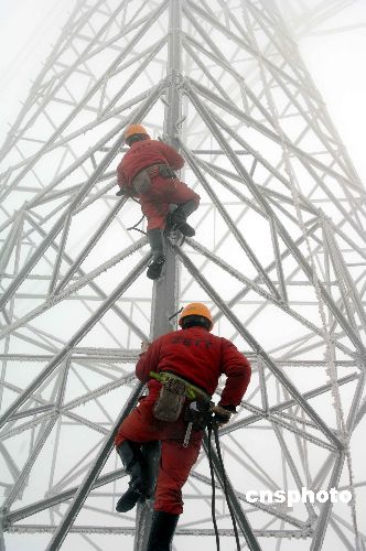 图:浙江省冰冻严重 送变电职工抢修超高压线