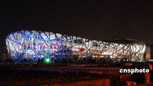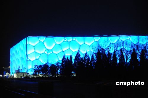 1月29日晚,北京国家体育场(鸟巢)景观灯亮了,与国家游泳中心(水立方)遥相辉映。中新社发 冯军(北京) 摄