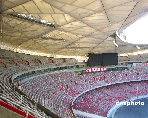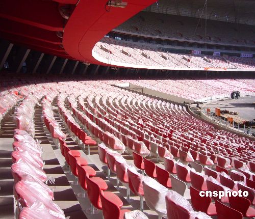 2008年1月29日,由中国石化承担的北京国家体育场“鸟巢”8万个固定座椅的原料研发、外形设计、生产制作及现场安装项目圆满完工。各项收尾工作正加紧进行。据悉,座椅采用“中国红”和“长城灰”两种颜色,而且在室外耐紫外线照射下,三年风吹日晒颜色不发生变化。中新社发 玉龙 摄