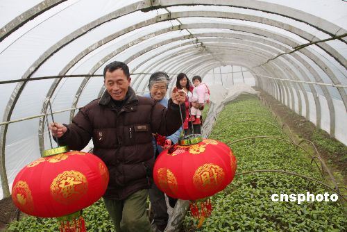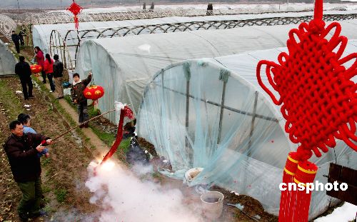 1月30日,离春节仅有一周,江西德兴市张村乡千亩无公害蔬菜基地的菜农们在遭遇了今年大雪和寒冻后,在自家的蔬菜大棚挂起了红红的中国结和灯笼,鸣放鞭炮,呈现一片欢喜和谐的气氛,给即将到来的新春佳节增添了浓浓的喜庆。中新社发 卓忠伟 摄
