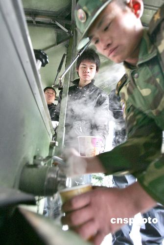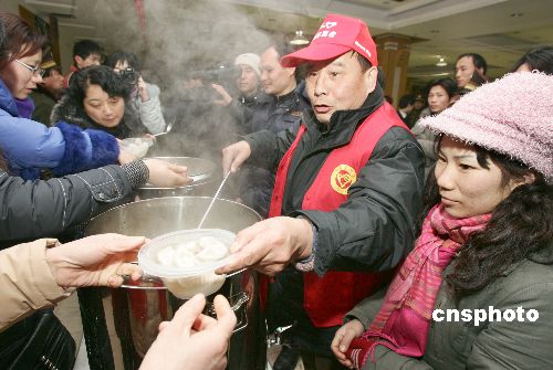 近期由于受大雪天气影响导致国内大范围的铁路、公路交通受阻或中断,使大批返乡旅客滞留杭州火车站、杭州火车东站和市区各大长途汽车站,从1月27日起,杭州市开辟了部分剧院、大厦、会展中心、体育馆等公共场所及搭建军用帐篷等作为滞留旅客的临时驻留点。至1月30日下午,已先后接待了近10万人次的滞留旅客,当地的政府部门、企事业单位、部队、公安、街道、卫生、共青团、市民志愿者等纷纷行动起来,按照“有水喝、有饭吃、有地方安顿、生病有医治、困难群众有救助”的要求,以各种形式尽力为所有滞留旅客提供生活保障和温馨服务。 中新社发 李忠 摄