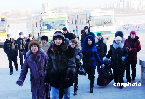 1月31日,大批俄罗斯旅游者进入黑河口岸。据黑河边检站披露:自黑龙江冰上汽车运输开始以来,黑河口岸进出境旅客达106000人次,同比增长45%。黑河口岸2008年实现首月进出境旅客“开门红”。中新社发 邱齐龙 摄