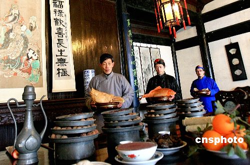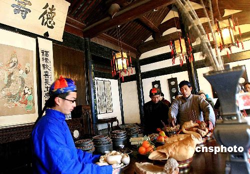 1日31日,三位穿着清代服装的男演员分别代表祖孙三代,在浙江绍兴市区的鲁迅祖宅内彩排过“小年”习俗。当日是小年夜后的第一天,按绍兴传统小年夜要举行祝福祭祀,这一习俗因鲁迅笔下的《祝福》而闻名全国。中新社发 袁云 摄
