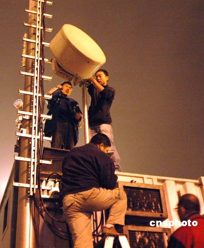 图为广州移动通讯运营商在广州火车站广场启动应急通信设备,确保网络畅通。