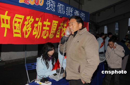 近期受连续雨雪和冻雨天气影响,大批旅客滞留广州及韶关等地。广州移动启动现场应急通信保障,向滞留旅客提供免费电话服务,向家人报平安。同时发送定向短信,第一时间通报春运动态。中新社发 谭颖 摄