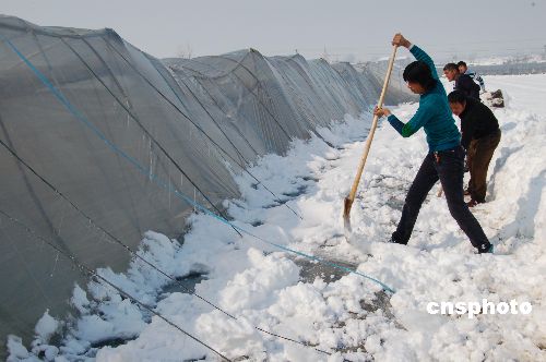 1月31日,安徽省含山县仙踪镇唐庄村村民正在整理被大雪压塌的草莓大棚。当日,天气放晴,当地农民立即开展生产自救,减少雪灾造成的损失。中新社发 田斌峰 摄