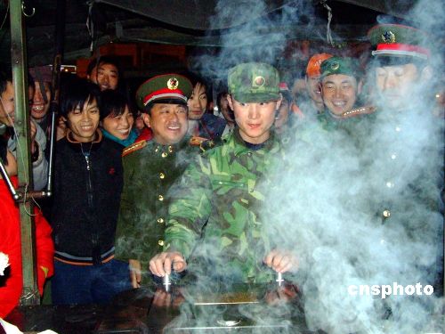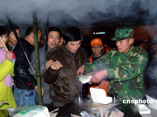 1月31日21时,南京军区“硬骨头六连”所在师官兵在浙江杭州火车站烧制了200公斤水饺,保证滞留旅客吃上热腾腾的晚饭。中新社发 邱柏星 摄