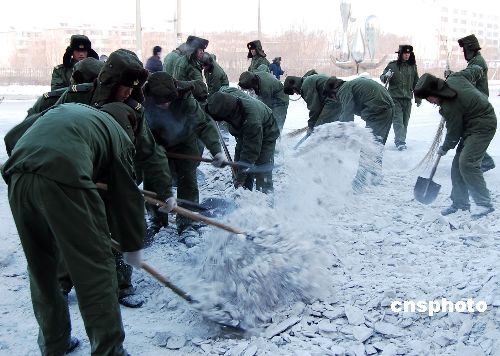 1月31日,解放军官兵和交警在铲除路面积雪。自1月12日以来,持续不断的降雪、冰冻气候,给河西走廊中部的甘肃临泽县人民生产生活和交通安全造成了严重影响。灾情发生后,当地党委政府积极采取多项措施,清除冰雪,确保道路交通安全畅通。中新社发 李自明 摄