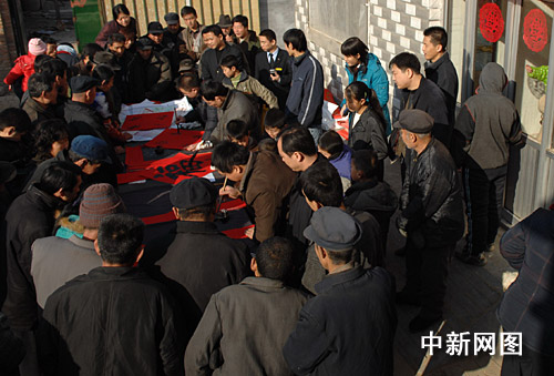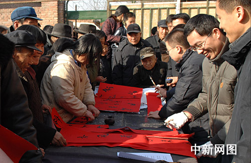 1月31日,河北沧州市部分书法家、企业家来到“感动中国支教模范”白芳礼的家乡沧县白贾村,为乡亲们书写春联。王少华 摄