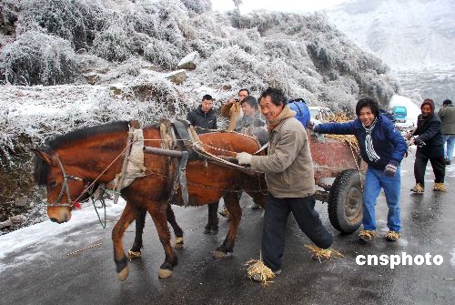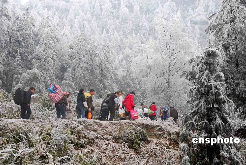 2008年1月31日,在贵阳市海拔二千多米的高坡乡,公路上凝冻有1.5公分厚。许许多多在外打工的农民工肩上担着过年货,脚下绑扎着稻草,使用各种方法赶路回家。中新社发 张天林 摄