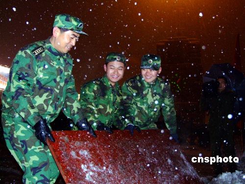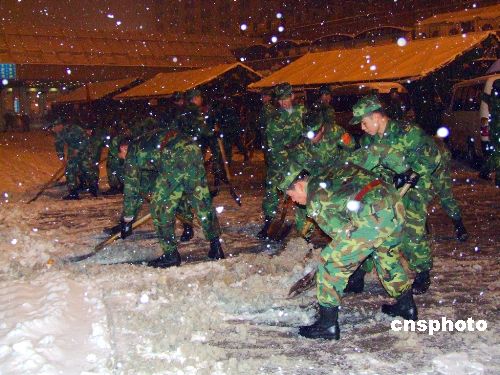 2月1日23时30分,南京军区“硬骨头六连”所在师400多名官兵,在杭州火车站清扫积雪。中新社发 邱柏星 摄