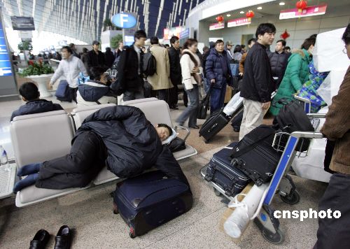2月2日,上海再遇暴雪,浦东国际机场春运工作受到严重影响。仅2月1日,上海虹桥、浦东两机场共延误二百多个航班,取消十多个航班。图为一位旅客在候机大厅酣睡。中新社发 潘索菲 摄