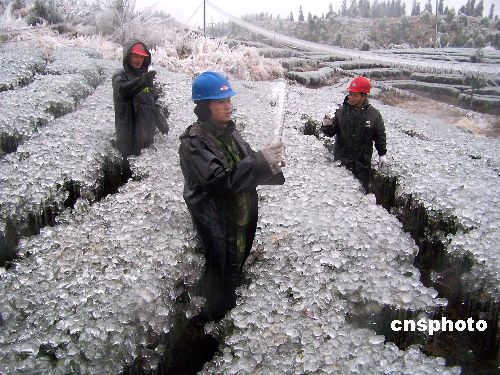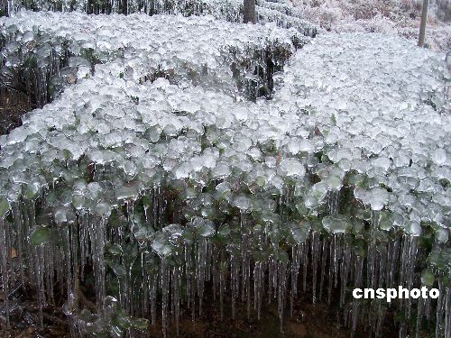 2月1日,广西昭平东潭岭高山茶园的茶树结满冰凌。自1月13日以来,该县遭遇近50年来持续时间最长的强冰冻灾害袭击,使6万多亩高山茶园遭受严重冻害,预计全县2008年春茶产量将减产20%左右。目前该县正组织茶农开展生产自救。中新社发 喻湘泉 摄