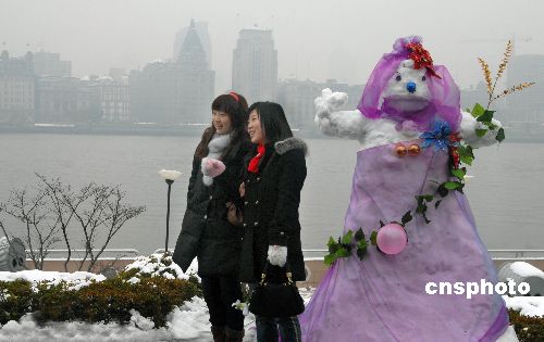 2月2日,上海黄浦江畔,游人与披着纱巾的雪人合影。