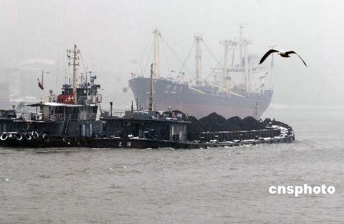2月2日,一艘装满煤炭的运输船冒着风雪前行,一只海鸥在飞翔。