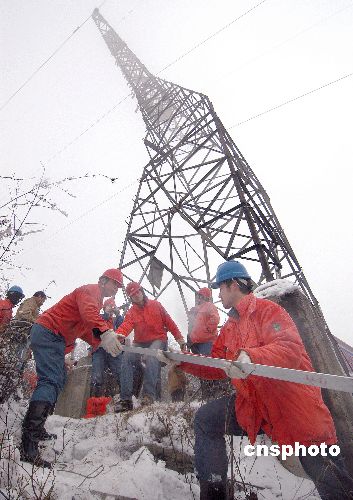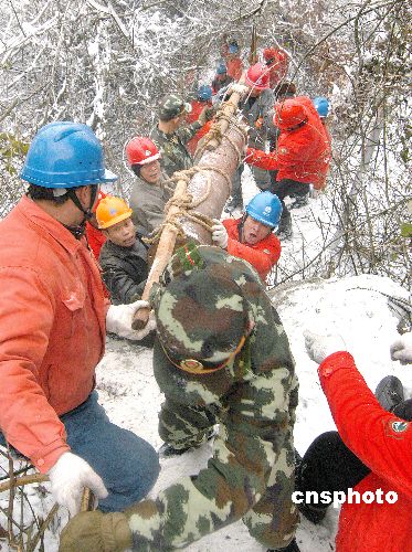 春节前夕,湖北省黄石市武警支队160多名干部战士与黄石供电公司近千名员工冒雪转运铁塔架。元月29日下午,位于黄石市黄荆山海拔400多米的黄石电厂至西塞山区石板路的22万伏高压线路突然断电,黄石供电公司迅速组织职工查找故障,巡线工人在黄思湾林场附近的一处山头,发现该线路19、20、21号铁塔严重弯曲,导线已经与铁塔接地。其中20号铁塔倾斜达30度,彻底失去供电能力,受损极其严重。由于受损铁塔位于较高的山顶,山上积雪达50厘米,施工环境十分恶劣,黄石供电公司组织的技术人员通过现场实地调研后决定,对两座倾斜铁塔进行更换,市武警支队与抢修人员正全力以赴运送15吨的抢修物资上山。中新社发 邱孝威 摄