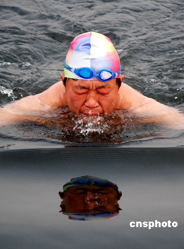 2月2日,一名冬泳爱好者在冰冷刺骨的湖水里披波斩浪。当日,在安徽省淮北市南湖国家城市湿地公园冰封的湖面上,30余名冬泳爱好者破冰后跃入水中,以冬泳的方式迎接新春佳节的到来。中新社发 谢正义 摄