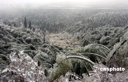 自1月16日以来,受冷空气南下和低空切变南压影响,福建龙岩长汀县持续低温阴冷,山区大范围出现冻雨和雨夹雪天气,截至2月2日上午严重冰灾已造成长汀县直接经济损失四点二五亿元。目前,该县仍有六个乡镇、五十七个村、二百个自然村尚未恢复正常供电。中新社发 黄启元 摄