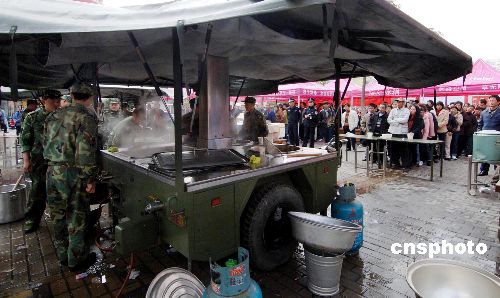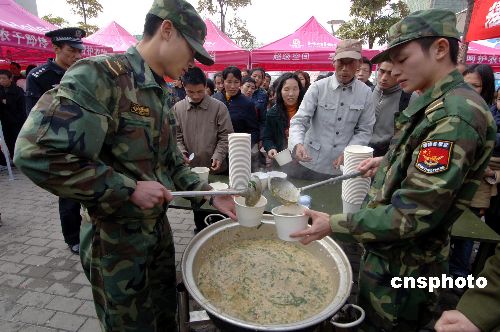 2月3日,一辆野战炊事车开进福州火车站,现场熬制粥、姜汤等御寒食品,服务滞留旅客。当日,福州火车站仅一辆福州至九江的列车停开,据火车站工作人员介绍,当天将发送旅客预计在五万人左右。中新社发 王东明 摄