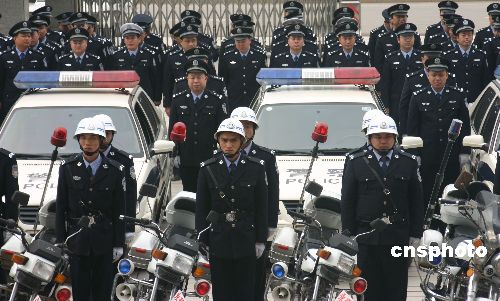 2月3日,公安警察庄严宣誓。当日,重庆永川区公安局举行“2008东亚女足锦标赛安保工作誓师大会”,全局500名干警参加了誓师大会,确保治安环境,确保女足锦标赛顺利举行。中新社发 陈仕川 摄