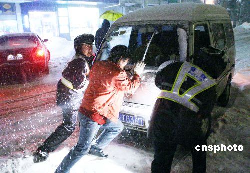 2月1日晚,交巡警在推动一辆陷于雪堆中的汽车。江苏宜兴市再次遭受暴雪袭击,宜兴市公安交巡警大队的众多交巡警冒雪到交通要道指挥交通,为群众排忧解难。中新社发 丁焕新 摄