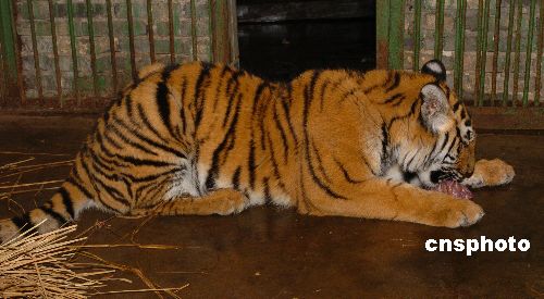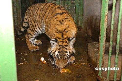 2月4日,在南昌动物园,华南虎“明明”正津津有味吃着饲养员送来的新鲜猪肉。“明明”(原名华华)出生于上海,其父是南昌动物园寄养在上海的雄性虎。它约半岁时运回南昌,与成年虎相比,这只小华南虎特别活泼好动,惹人喜爱。由于患有双目先天性白内障,小虎走路时经常碰壁,并且总是凭嗅觉发现食物。1月27日,南昌大学二附院眼科专家为小华南虎成功实施国内首例华南虎白内障摘除术。经过一个星期的术后恢复,情况良好的小华南虎被送往笼舍重新恢复与游客见面。为纪念小华南虎获得健康视觉,南昌动物园将华南虎“华华”更名为“明明”。中新社发 朱文标 摄