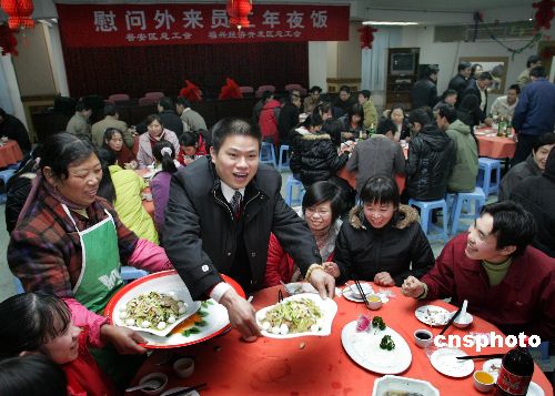 2月4日晚,在福州市福兴投资区务工的老陈喜洋洋地在食堂端上热腾腾的美食,和工友一起提前吃上了一顿丰盛的年夜饭。老家湖南的他今年因暴雪无法回家过年,据了解,福州仅晋安区像老陈这样的滞留外来工有5000多人,当地政府和工会组织近期陆续为区内滞留外来工准备了600余桌的年夜饭,让不能回家的农民工兄弟感受到在福州过年的温暖。中新社发 包华 摄