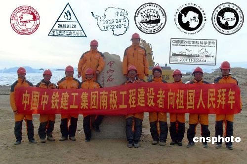春节将至,随中国第24次南极考察计划在南极实施中山站建设工程的中国中铁建工集团11名职工,在中山站纪念碑前向祖国人民拜年。南极地理状况复杂,基岩硬度高,冻土层深的条件下,每天工作16个小时以上,园满的完成了各工程节点的任务,被称为“铁军”。中新社发 同德 摄