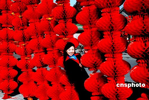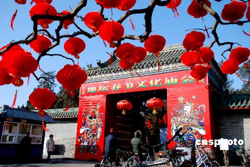 2月5日,北京地坛公园门口装饰一新、喜气洋洋。从2月6日到13日,北京地坛将举办2008年北京特色传统庙会。今年的庙会除了传统的民俗表演项目外,还将川剧、吉尼斯奇人绝技等引进,更加丰富多彩。中新社发 杨慧峰 摄