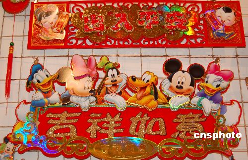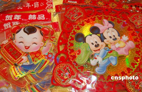 2月5日晚,广西南宁街头“米老鼠”造型的春节饰品。有八十年历史的美国“米老鼠”,在中国农历鼠年即将到来之际进军中国春节市场受到欢迎。拥有四千多年历史的中国最盛大、最热闹的传统节日——春节,开始融入西方元素。中新社发 刘万强 摄