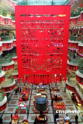 2008年2月9日,沈阳商业城共享大厅空中高悬有四层楼高、用红绸布特制的巨大“挂签”,上面还剪刻了栩栩如生的米老鼠,以欢度新春佳节。 中新社发 刘宝成 摄