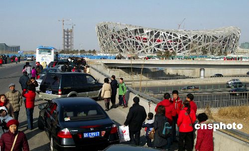 2月10日,位于国家体育场--鸟巢南侧的北辰桥上大批市民在拍照留念,造成北四环拥堵。因高架桥上视野开阔,角度颇佳,拍照者多将私家车随意停在行车道上,严重影响其他车辆通行。北京交警随后赶到将人群疏散,禁止后续车辆无故在此停靠。中新社发 富田 摄