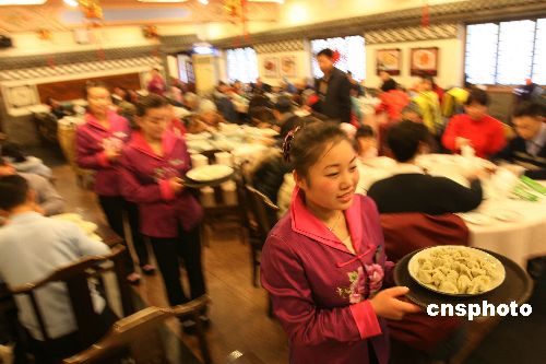 2月11日,北京惠丰饺子楼的服务员给顾客上饺子。当日是农历正月初五,俗称“破五”,民间素有吃饺子的习俗。从中午开始,北京许多饺子馆生意红火,一些市民通过吃饺子寄托对幸福生活和美好明天的期盼。中新社发 陈晓根 摄