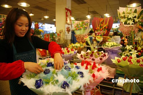 2月11日,上海各路花商纷纷展开“情人节鲜花”市场的布局,图为花商为最畅销的进口“蓝色妖姬”包装。据了解,“蓝色妖姬”近年来一直受上海人宠爱,由十一支进口“蓝色妖姬”组成的花束,代表着“一心一意”口彩,是“情人节”中花中新贵,通常价格在千元以上。中新社发 潘索菲 摄