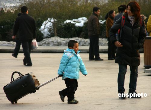 2008年2月11日,春节长假接近尾声,人们纷纷踏上返程路,有的回家,有的奔赴工作岗位。南京火车站因此迎来春节后的客流高峰。中新社发 阿董 摄