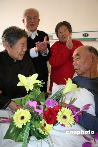 2月13日下午,在山东聊城光明眼科医院老年护理中心,78岁的刘跃明(左一)向丈夫边松献上一束玫瑰,来纪念夫妻53年的风雨同舟。据了解,边松于2008年1月,因患脑出血造成上指活动障碍。中新社发 孔政 摄