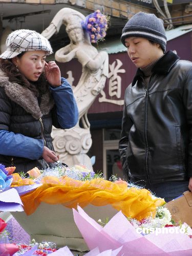 2月14日情人节,安徽省合肥市大街小巷都弥漫着浪漫的气息。一卖花商家出奇招,将店门口的城市雕塑打扮的花枝招展以吸引路人眼球。图为商家在“执花起舞”的女神下向顾客介绍着成品花捧。