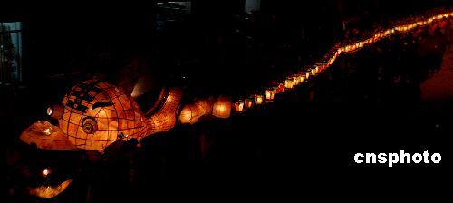 2月13日晚,在江西婺源清华镇街头,200余名农民舞动着长近200余米的“板凳龙”。据悉,该制品由200多个花灯和上百个农家板凳连接而成。中新社发 王国红 摄