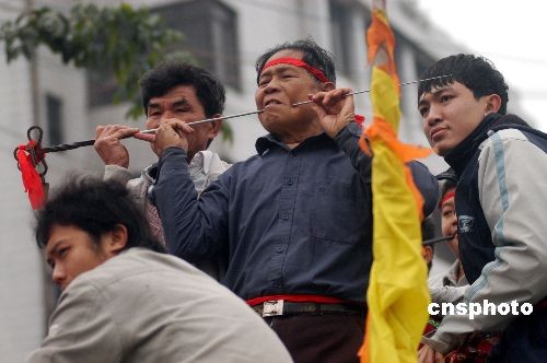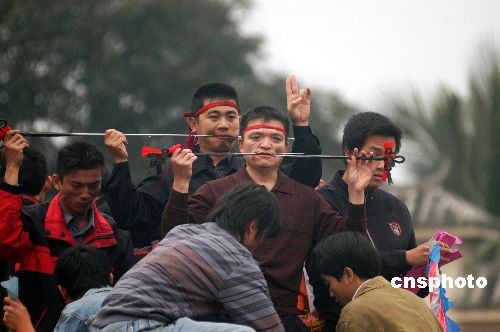 2008年2月16日,琼海市,祈求五谷丰登,风调雨顺。“军坡”是海南民间的一个传统节日,相传源于唐代,为纪念六世纪我国岭南著名俚人首领冼夫人而举行的祭祀活动,距今已有1300多年历史。独特的民俗风情吸引了大批游客。中新社发 蒙钟德 摄