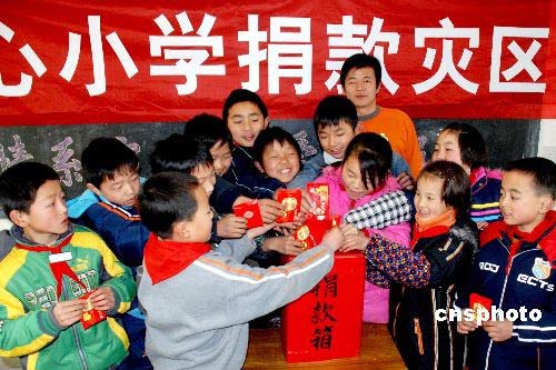 2月17日,婺源县溪头中心小学学生高举自己的压岁钱包,准备向灾区进行募捐。当日,江西婺源县中小学开学,该县溪头乡小学组织全乡小学生开展向灾区捐款活动,该校500余名学生把新年压岁钱拿出来,向遭受雪灾的灾区进行捐款。中新社发 王国红 摄