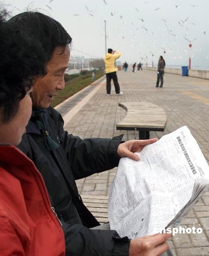 2月18日,两位云南省昆明市民在滇池边看报纸上刊出的昆明官员联系方式。日前,昆明市决定向社会公布该市官员职务分工情况和联系电话,《昆明日报》整版公布信息后受到昆明市民热烈抢购。中新社发 李一波 摄
