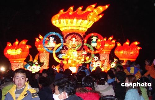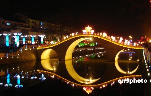 2月19日,正月十三晚6时,江苏仪征市华灯初放,古楼景观区20多组彩灯在夜幕下交相辉映,显得壮观艳丽。当晚仪征市10多人涌向灯展区观灯。中新社发 黄建林 摄